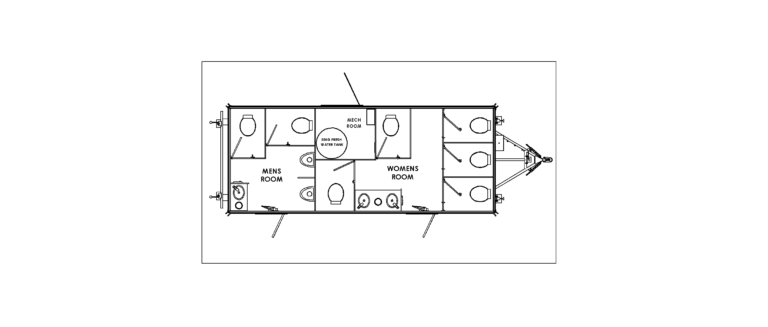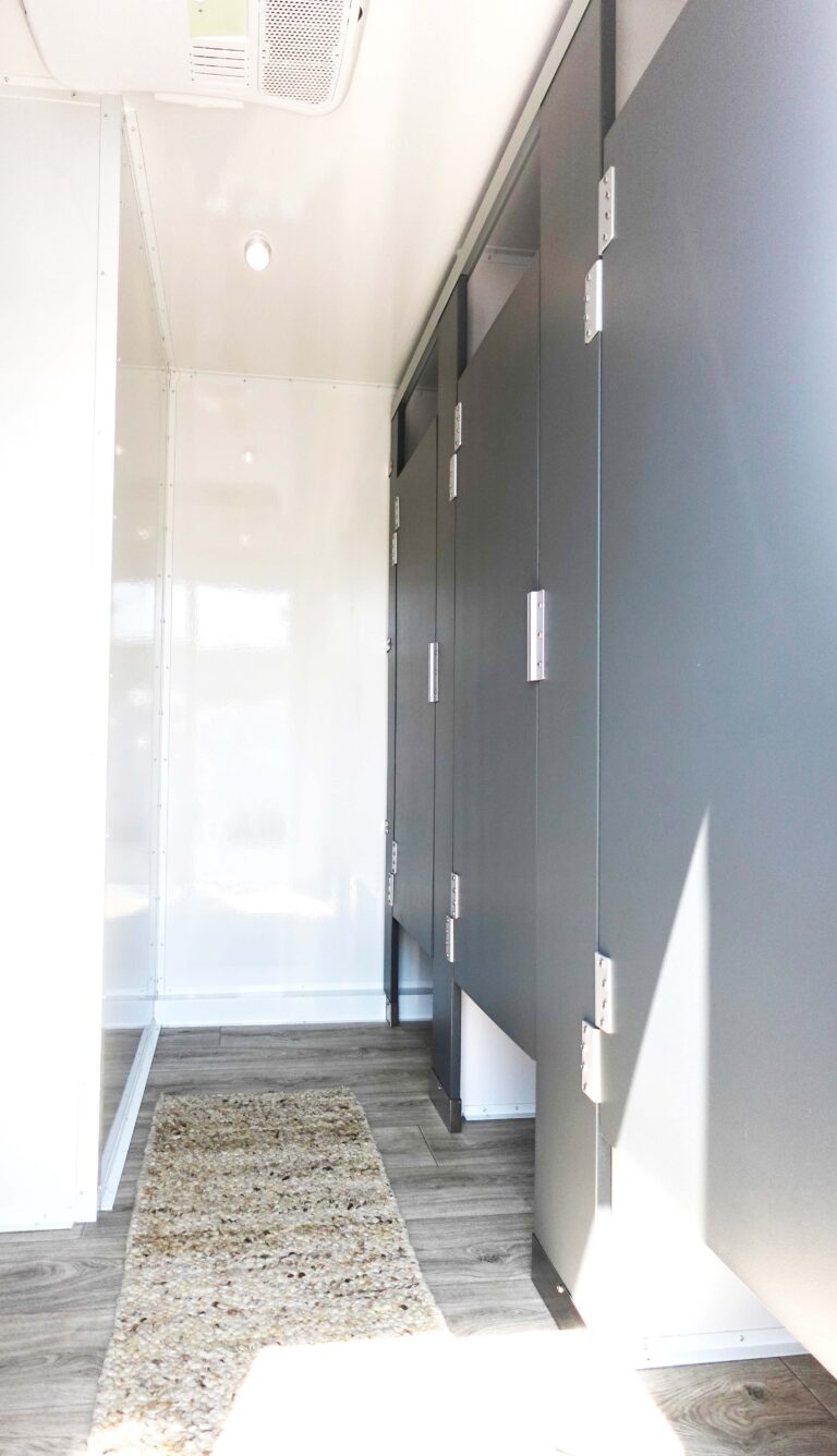 The 9-Station Restroom Trailer is engineered for major events with up to 900 guests or job sites supporting up to 90 employees. Its community layout includes a large women’s suite with five private toilet stalls and a double sink with vanity and mirror. The men’s suite features two private toilet stalls, two urinals, and a sink with vanity and mirror to efficiently handle heavy usage.